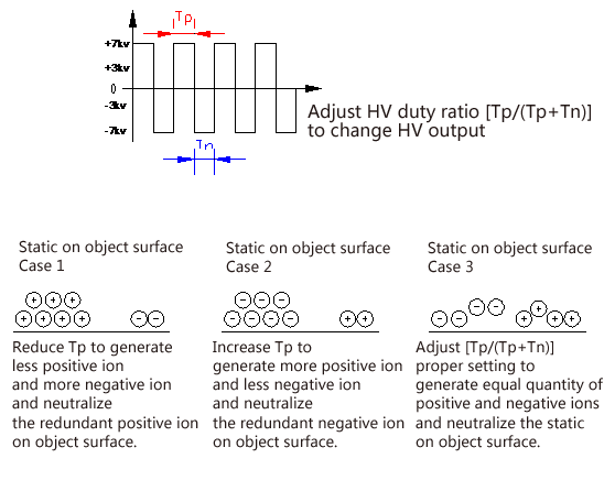 Notice :1*——Real-time airflow pressure values The ion balance performance will have difference depend on bar length,airflow pressure,working frequency,install distance;It should be adjusted duty ratio according to real working environment to make ion balance in best. | ||||||